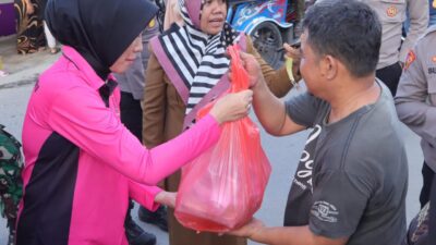 Bersama pengurus Bhayangkari dan pejabat utama Polresta Gorontalo Kota, Ny. Ivone Ade Permana membagikan 500 paket makanan siap saji kepada warga yang rumahnya masih terendam banjir.