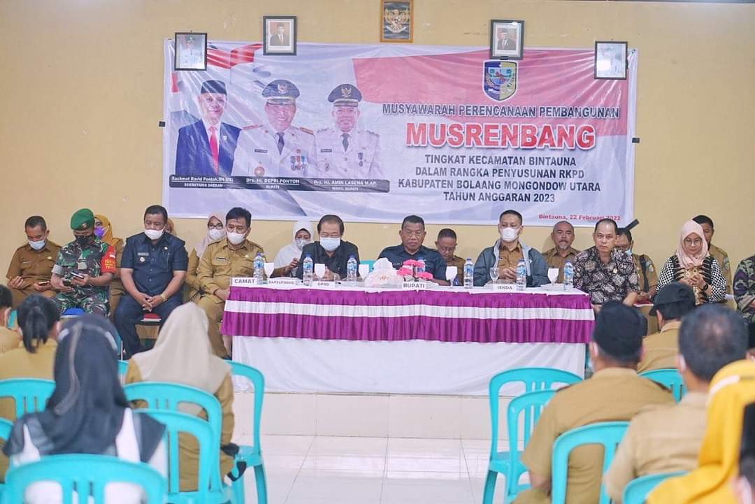 Demikian disampaikan Bupati Bolmut Depri Pontoh saat membuka kegiatan Musrenbang RKPD Tingkat Kecamatan Tahun 2022 di Aula Kantor Camat Bintauna, Selasa, 22 Februari 2022.