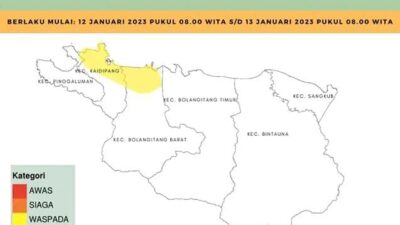 “Berdasarkan data satelit pada jam 07.40 UTC (15.40 Wita) terpantau adanya awan Cumulunimbus (awan hujan) menutupi wilayah Manado, Bitung, Kotamobagu, Minahasa Tenggara, Minahasa Selatan, Bolmong, Bolmong Timur, Bolmong Selatan dan sebagian wilayah Minahasa Utara dan Bolmong Utara, serta angin kencang yang masih terpantau terjadi di seluruh wilayah Sulawesi Utara,” imbau pihak BPBD melalui akun facebook BPBD Bolmut, Kamis (12/01/2023).