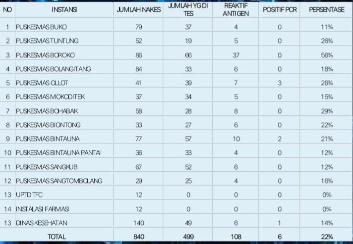 “Angka itu dari hasil searching dan tracking di semua puskesmas (PKM) yang ada di Bolmut. Dari 12 PKM di Bolmut, nakes yang positif telah melawati 10 persen dari keseluruhan jumlah nakes di setiap puskesmas,” ujarnya.